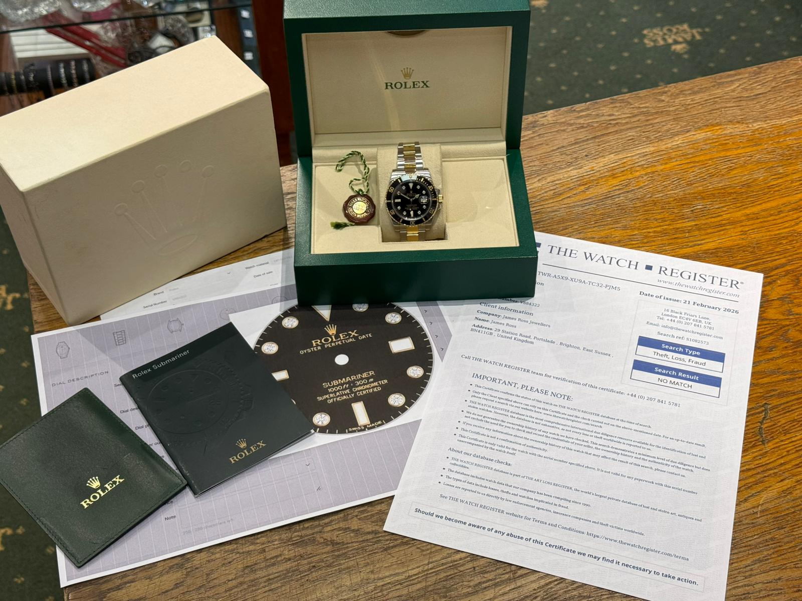 Presented in excellent condition, the watch comes with box, booklets, wallet and hang tag. While no original papers are present, the watch has been verified on the Rolex database confirming originality, in addition to a watch register check. Fully serviced and supplied with a two-year guarantee, this is a rare opportunity to acquire a standout Submariner reference.