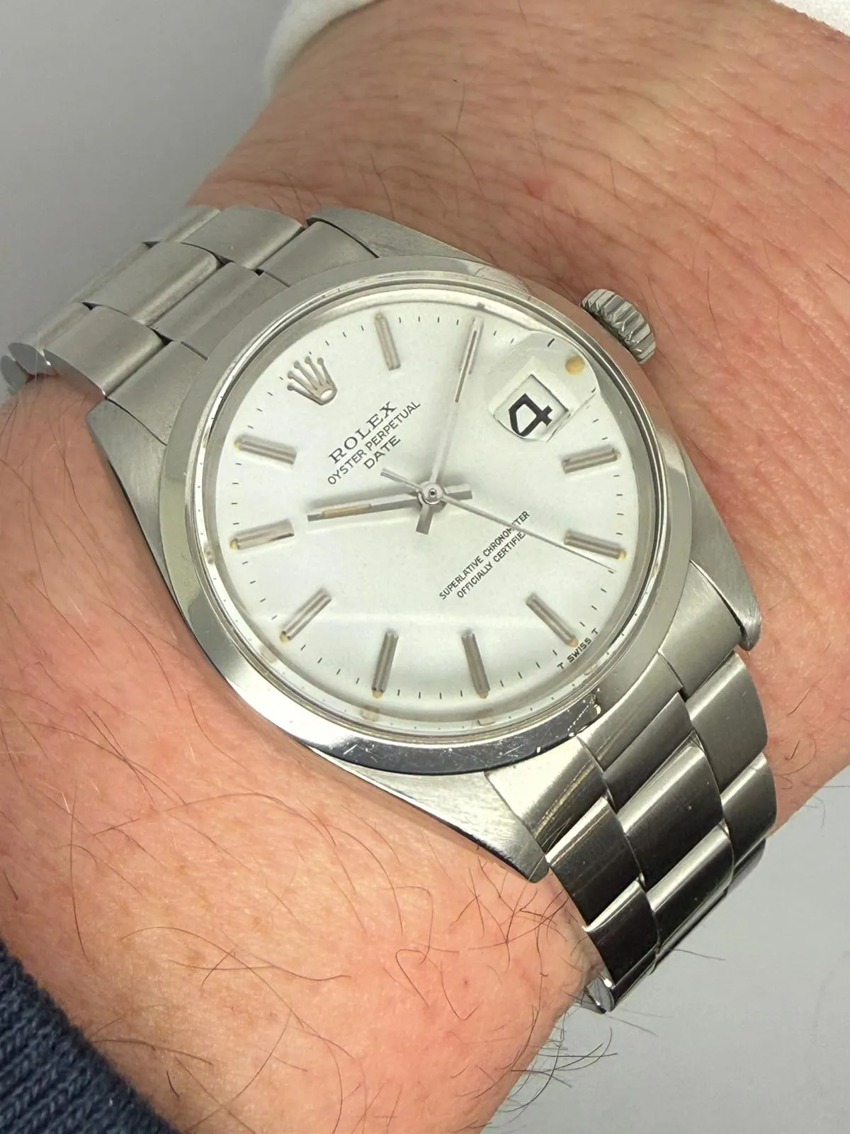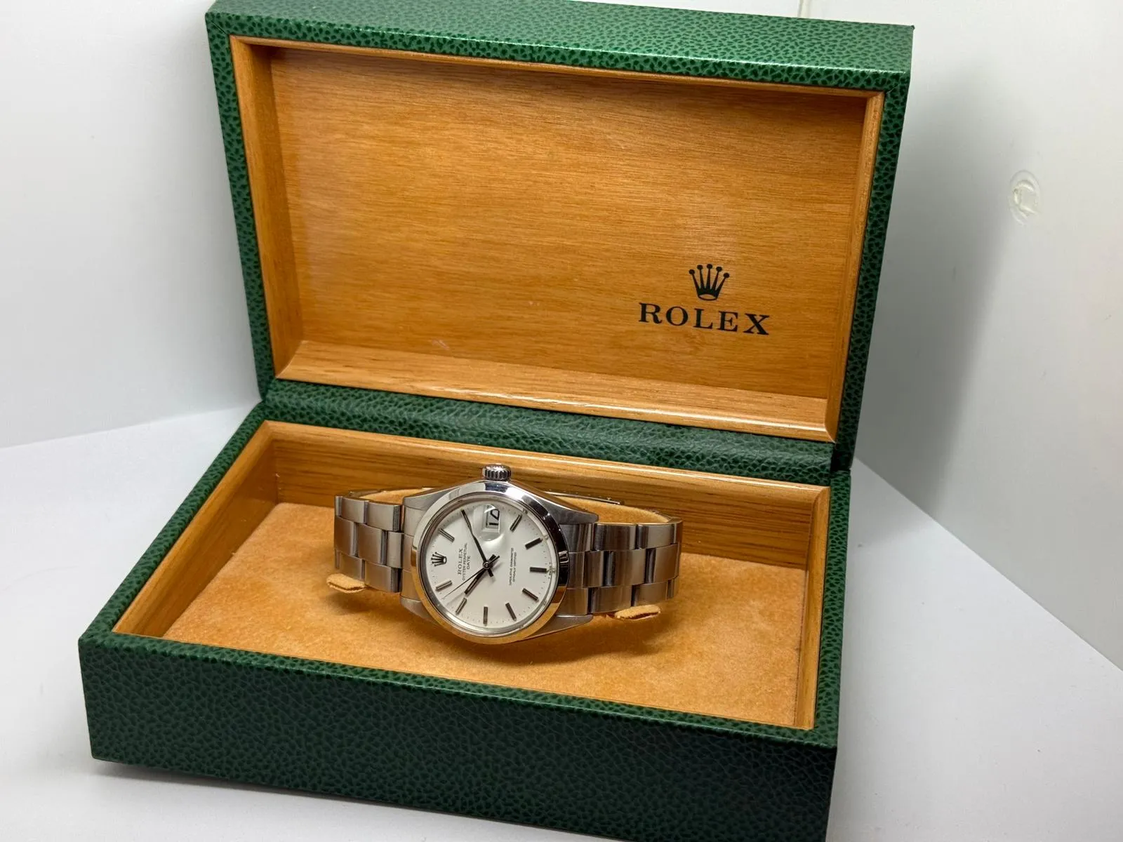 This 1967 Rolex Oyster Perpetual Date, reference 1500, features a classic 34mm stainless steel case paired with the original Rolex Oyster bracelet, delivering timeless proportions and everyday versatility. Powered by an automatic chronometer-rated movement, this model represents Rolex’s reputation for precision and durability.