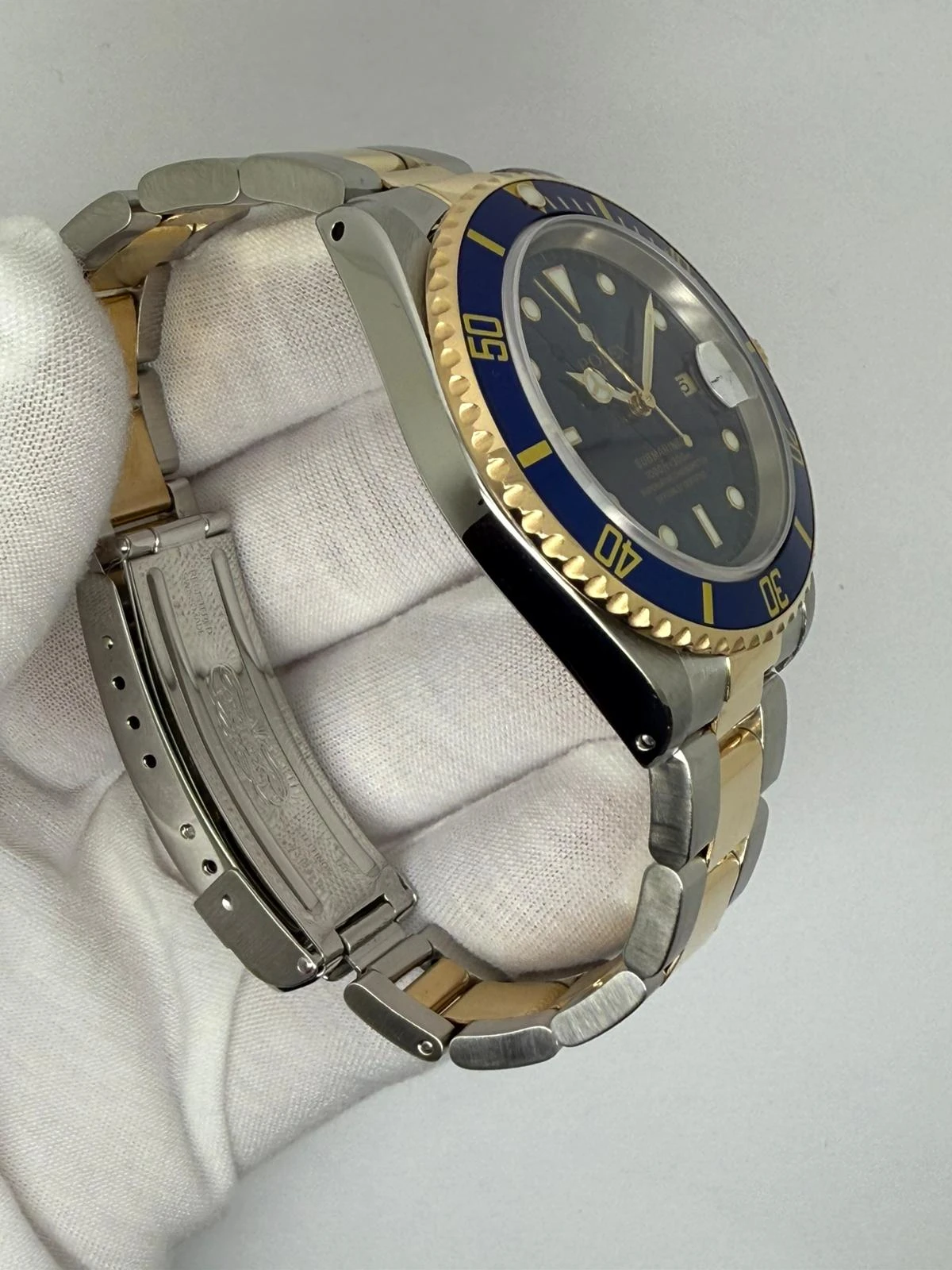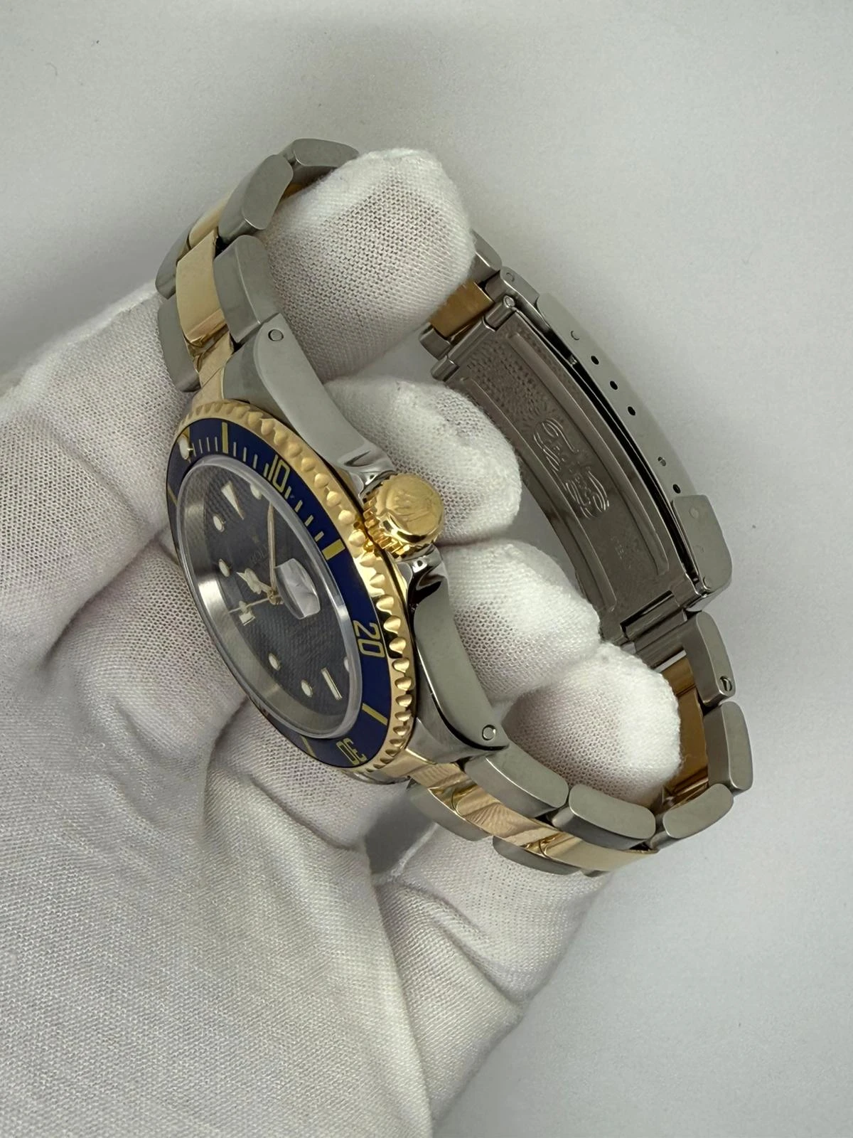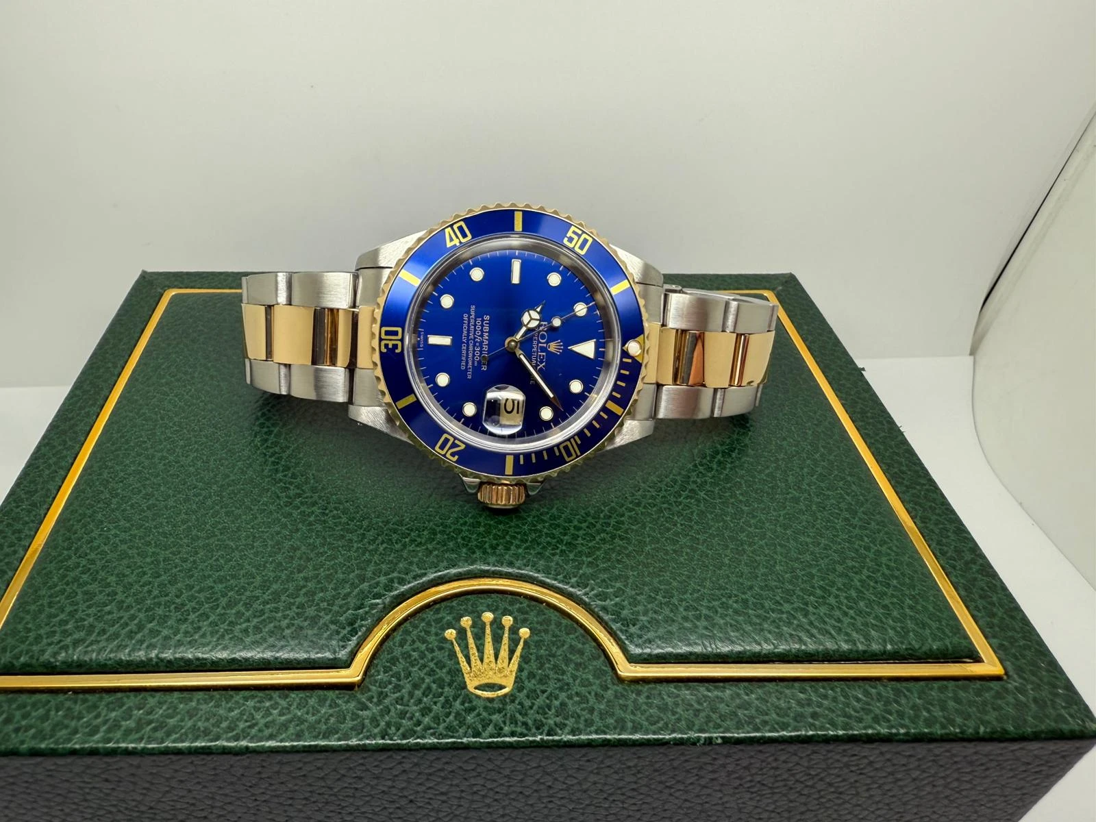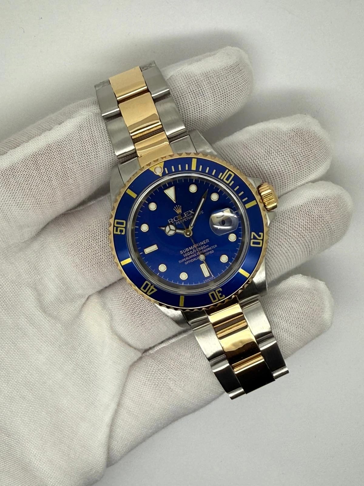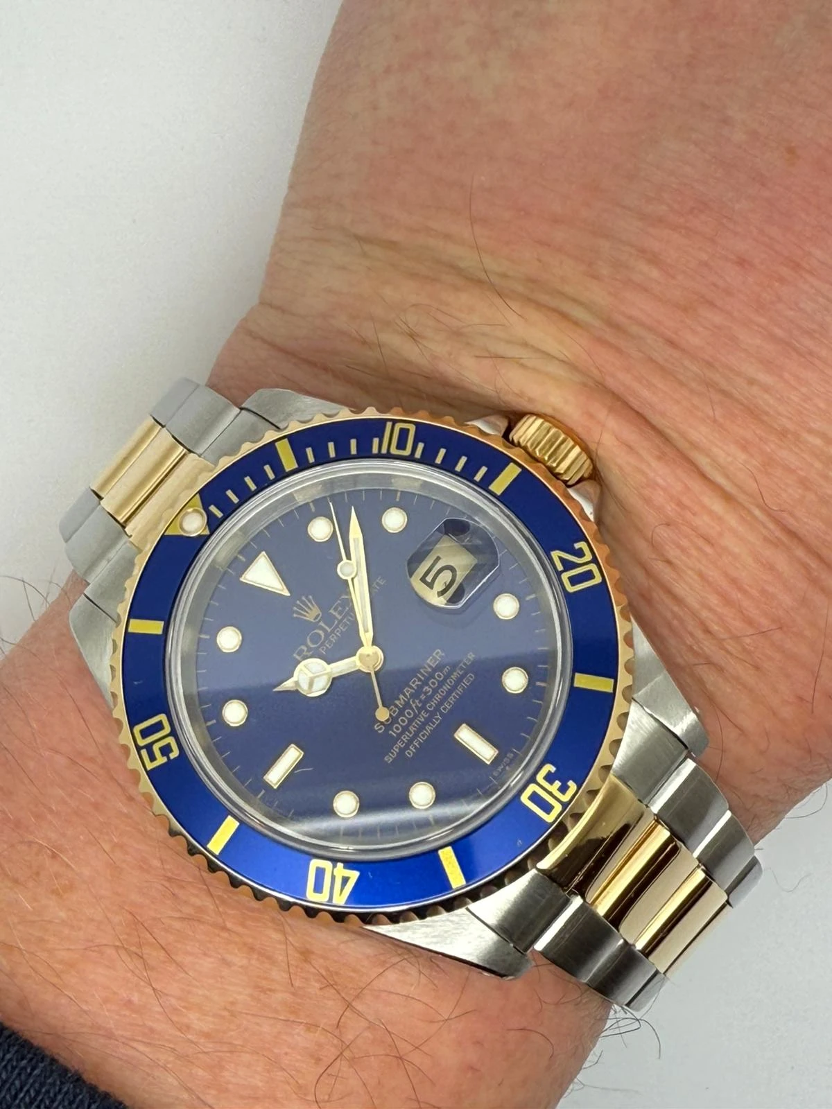 This 1997 Rolex Submariner Date, reference 16613, is the iconic ‘Bluesy’ model, featuring the classic combination of stainless steel and 18ct yellow gold with a striking blue dial and blue bezel. This example is in immaculate condition and has been fully serviced, supplied with a two-year guarantee for complete peace of mind.