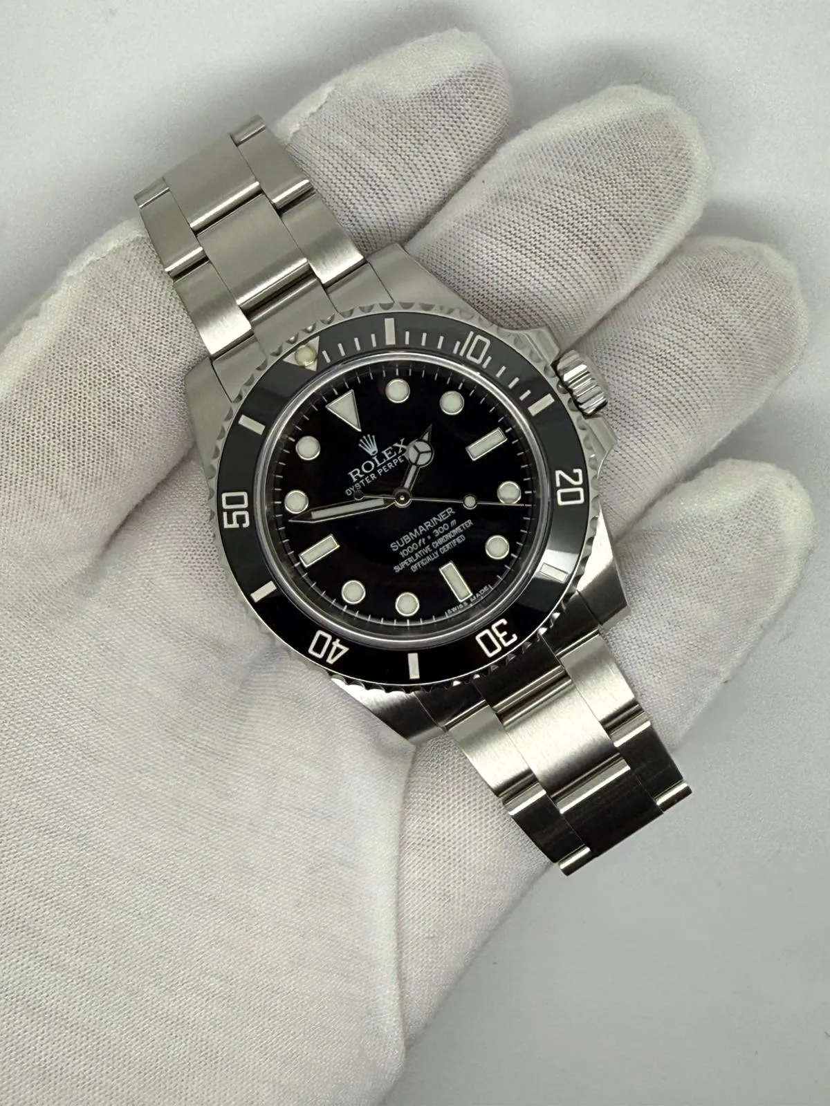 This 2015 Rolex Submariner No Date, reference 114060, features the classic 40mm stainless steel case with the clean, symmetrical black dial and black Cerachrom bezel that collectors love. Renowned for its purity of design and robust build, the no-date Submariner is widely regarded as the most timeless iteration of this iconic dive watch.