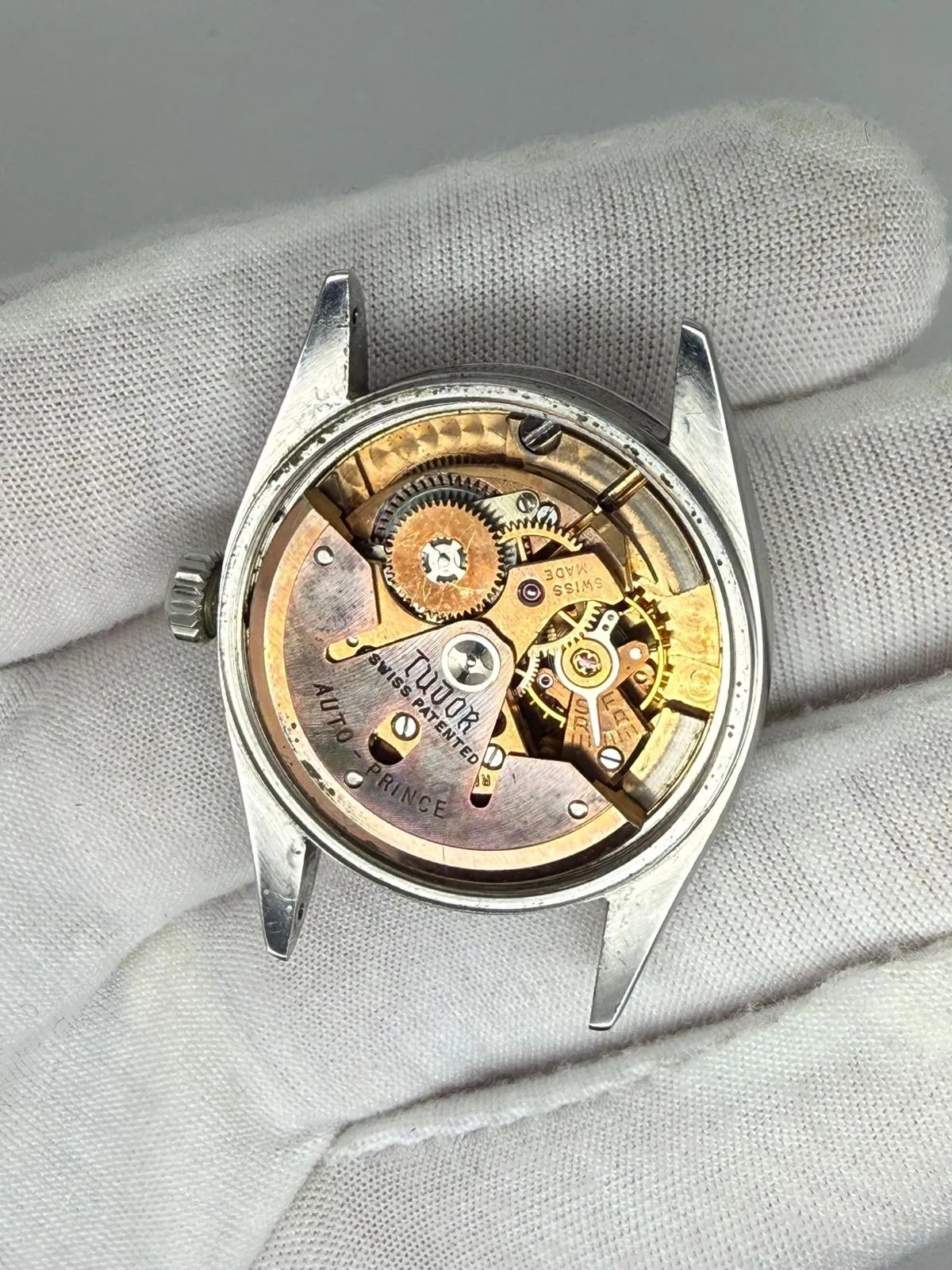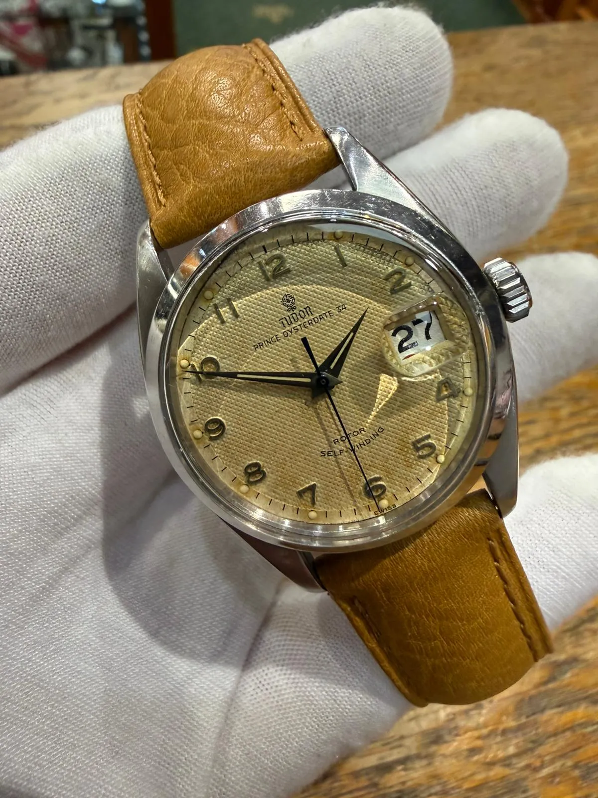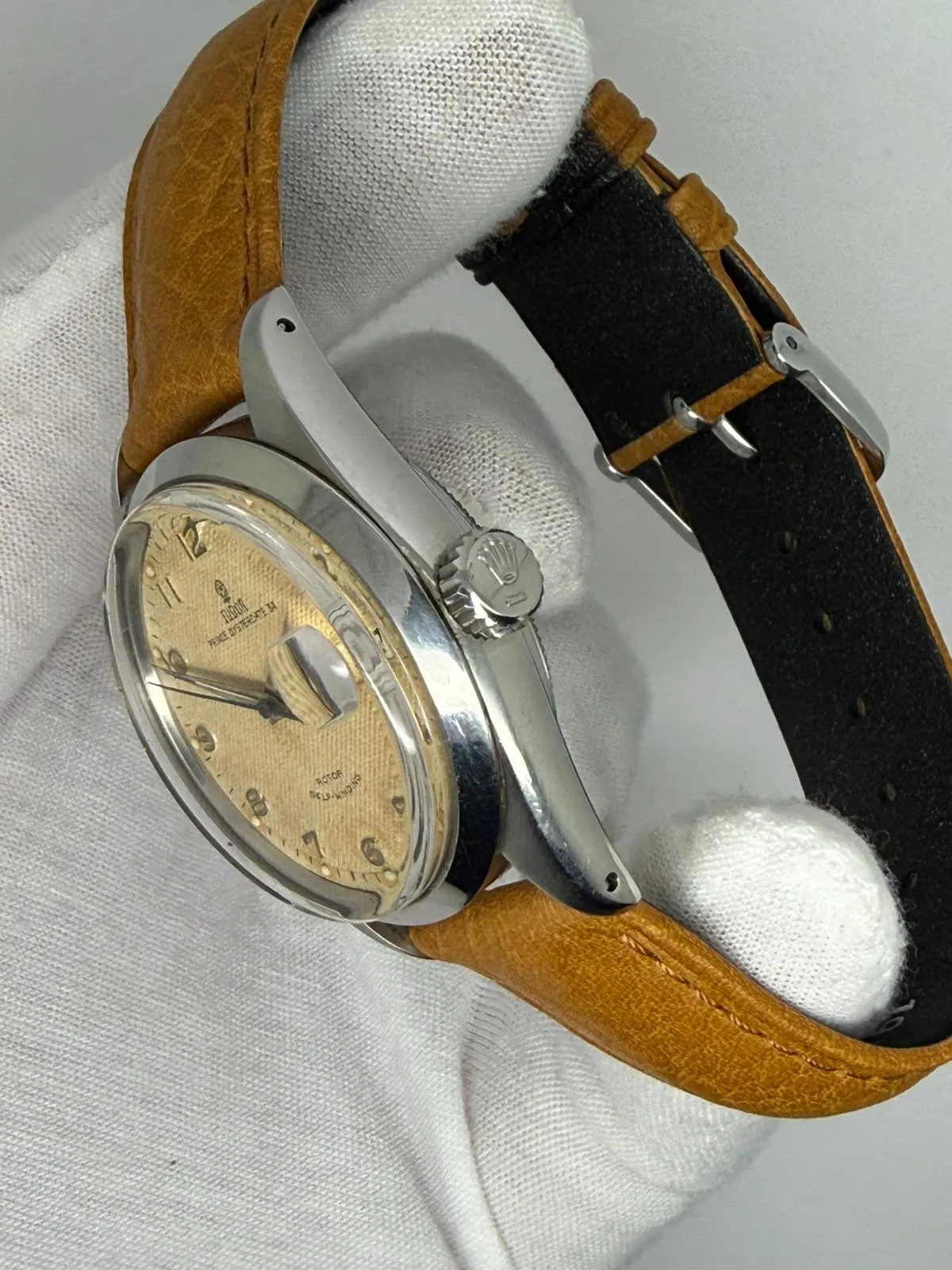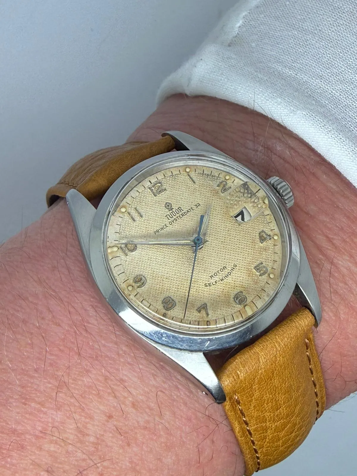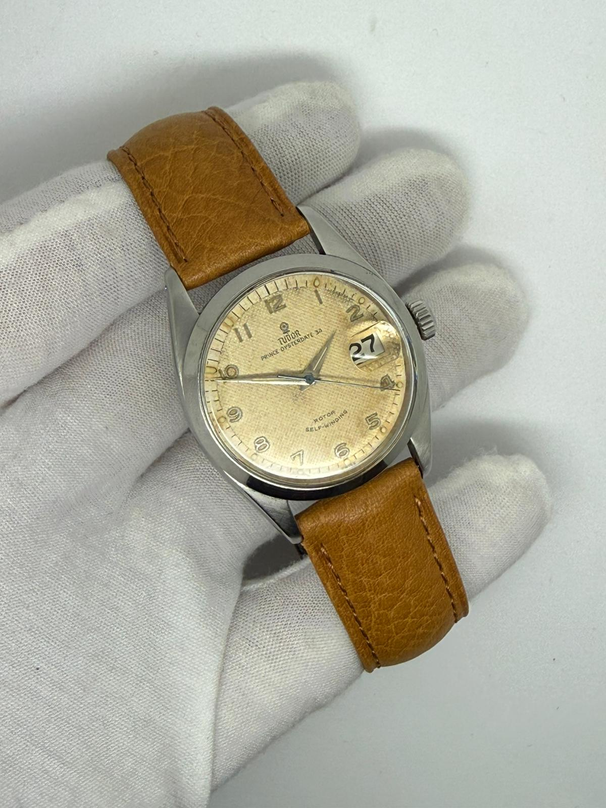 This characterful 1950s Tudor Prince Oysterdate, reference 7944, features a classic 34mm stainless steel case and a stunning honeycomb dial displaying beautiful, even patina. A highly collectible vintage Tudor with strong ties to Rolex heritage.