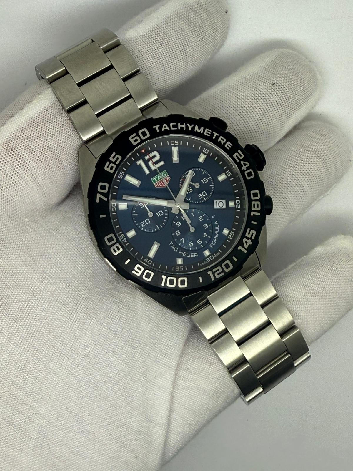 This brand new TAG Heuer Formula 1 Quartz Chronograph, reference CAZ101AV.BA0842, is presented with factory stickers still intact, offering a completely unworn example of this popular modern sports watch. Crafted in 42mm stainless steel, it is powered by a reliable Swiss quartz chronograph movement, delivering precision, durability, and everyday practicality.