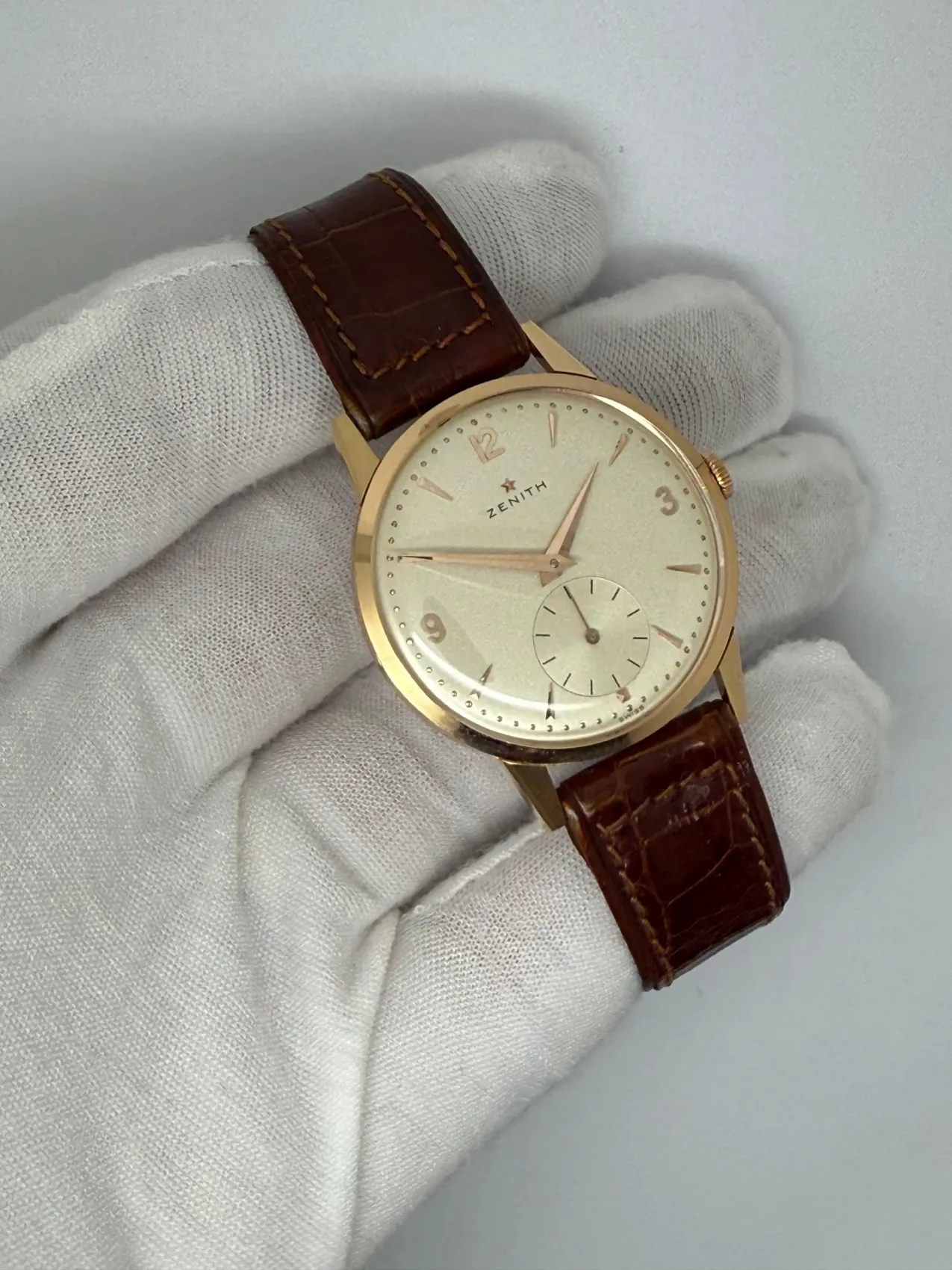 Presented in immaculate condition, this Zenith captures the understated beauty and craftsmanship for which the brand is admired. Its timeless design and precious metal construction make it not only a superb watch to wear but also a desirable collector’s piece. A true example of classic elegance, this vintage Zenith remains a standout choice for enthusiasts of fine Swiss horology.