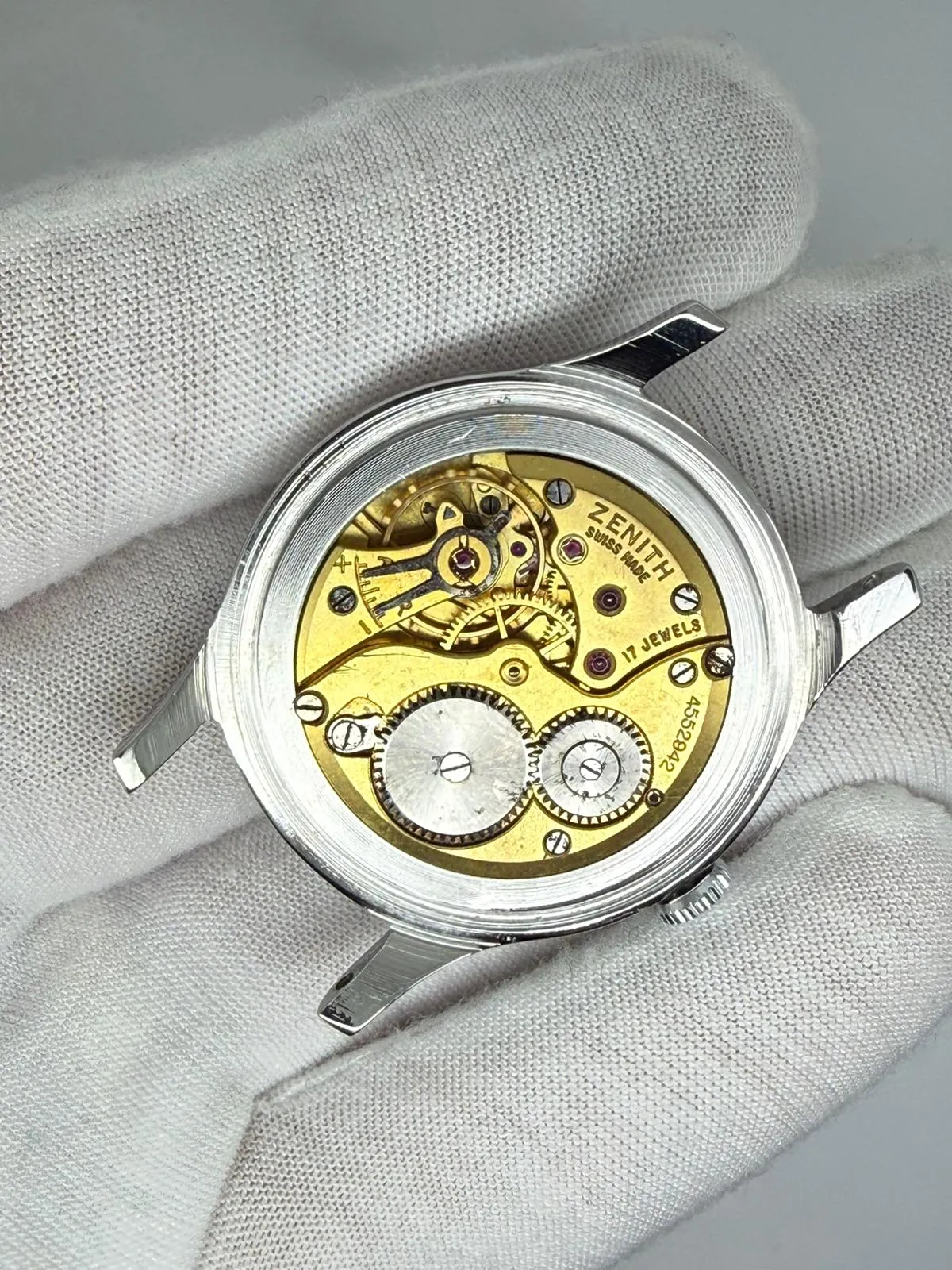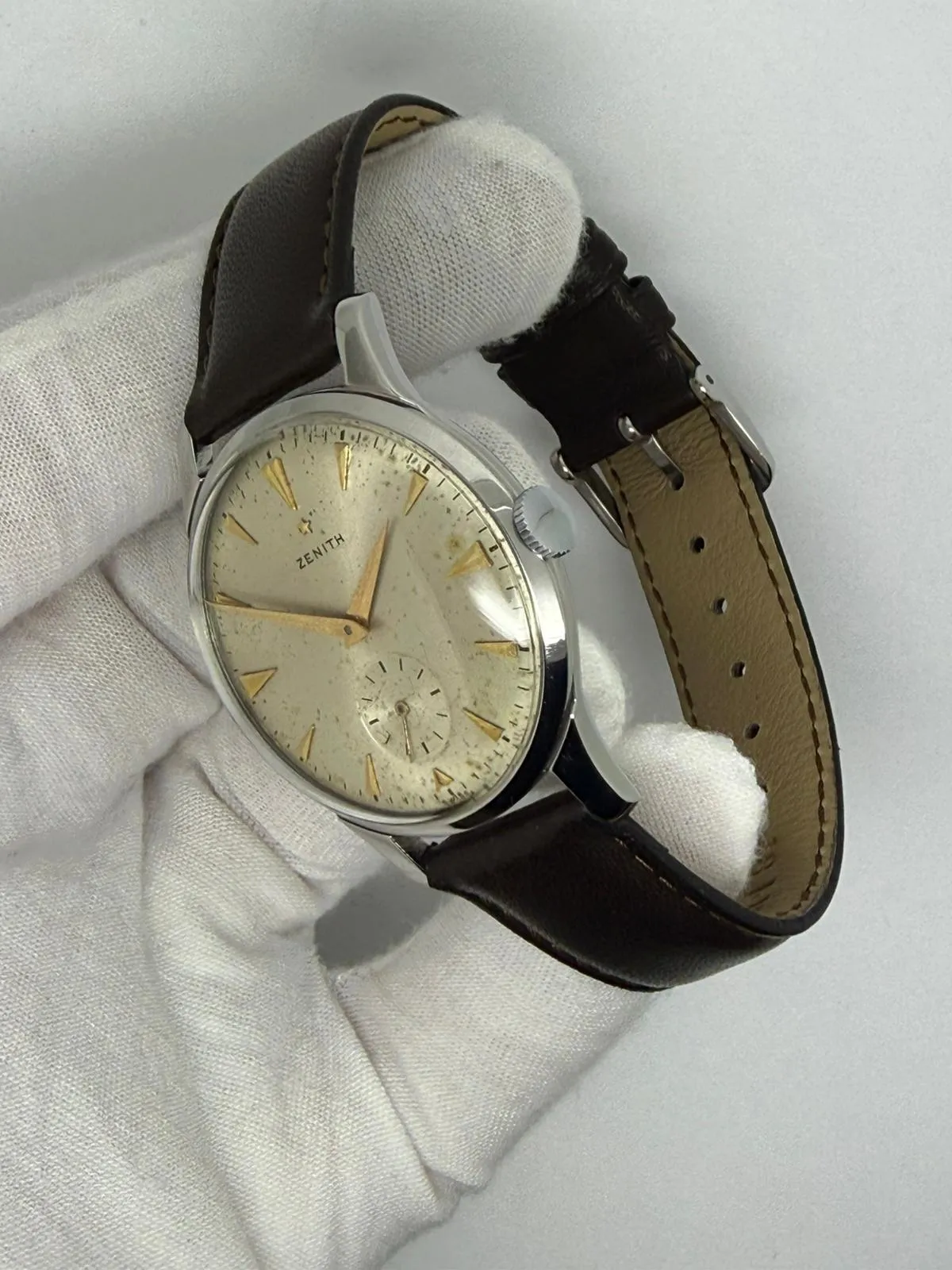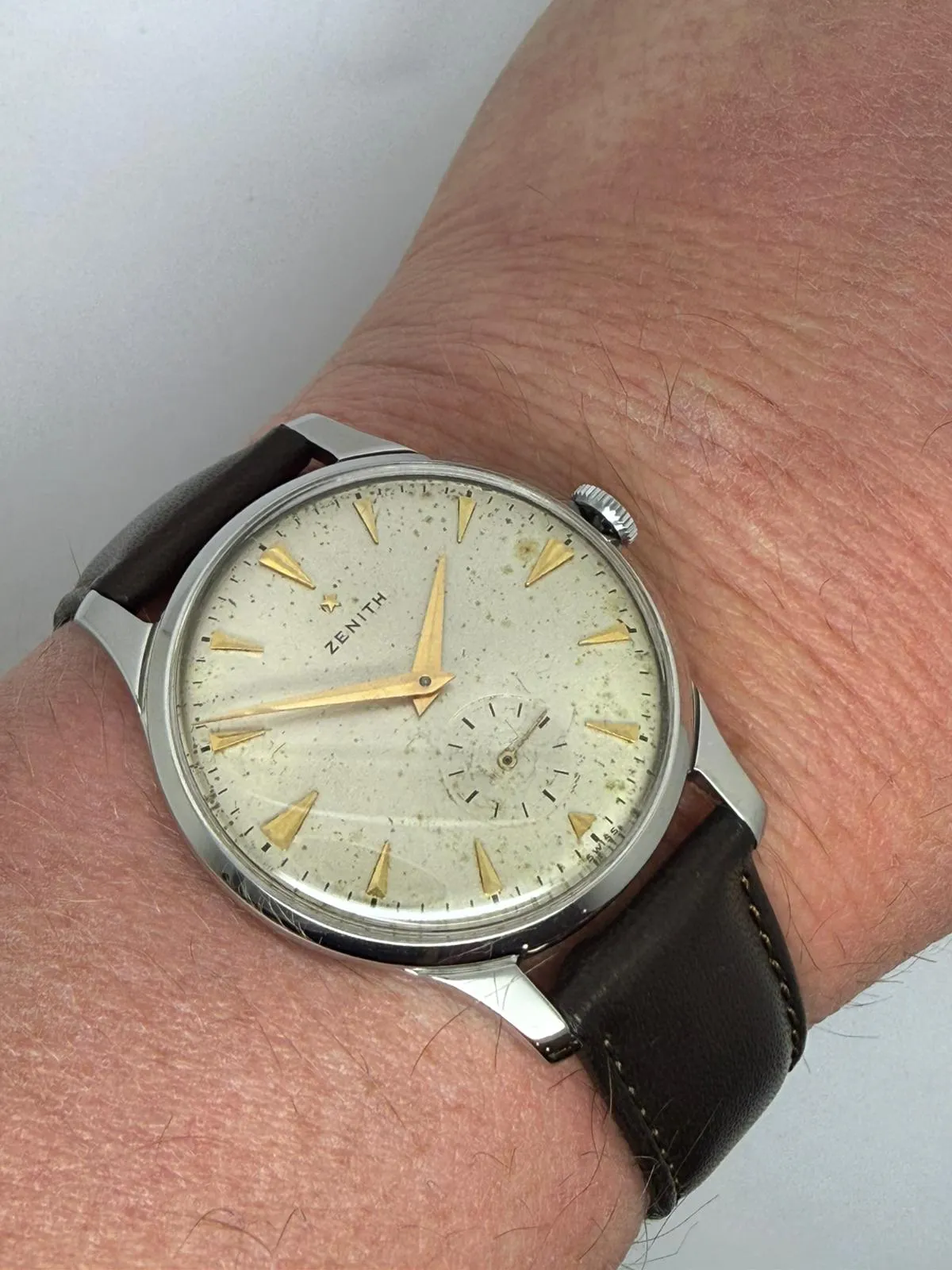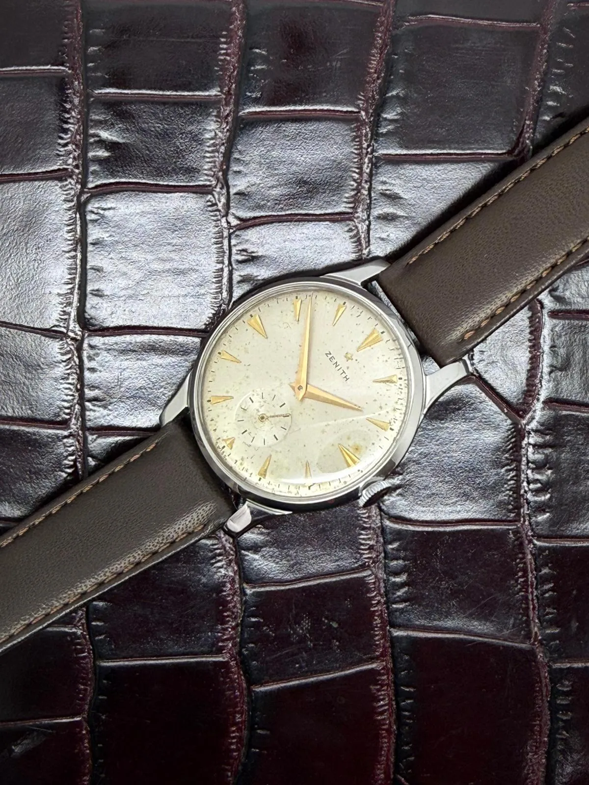 This elegant 1950s Zenith manual wind vintage wristwatch features a well-proportioned 36mm stainless steel case paired with a stunning silver dial with gold dial furniture, developing a beautiful and even patina over time. A refined example of mid-century Zenith craftsmanship.